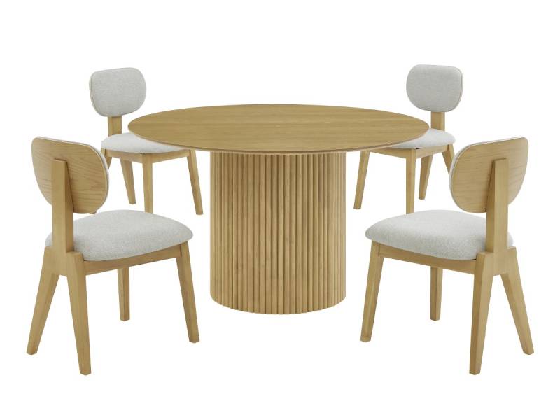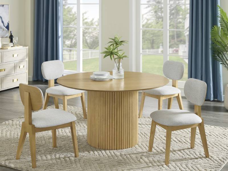 The Terra 5-Piece Dining Set is a sophisticated blend of modern design and functionality, perfect for contemporary homes. This set includes a beautifully crafted table and four matching chairs, all designed with a minimalist yet stylish aesthetic. The table features a sleek knife-edge tabletop paired with a striking vertical grooved base that adds texture and visual appeal. The chairs are upholstered in durable, 100% polyester fabric, offering both comfort and practicality. Constructed from premium rubberwood and oak veneer, the set boasts a rich natural oak color finish, enhancing its timeless elegance. Perfect for intimate gatherings or daily meals, this dining set seamlessly combines form and function.